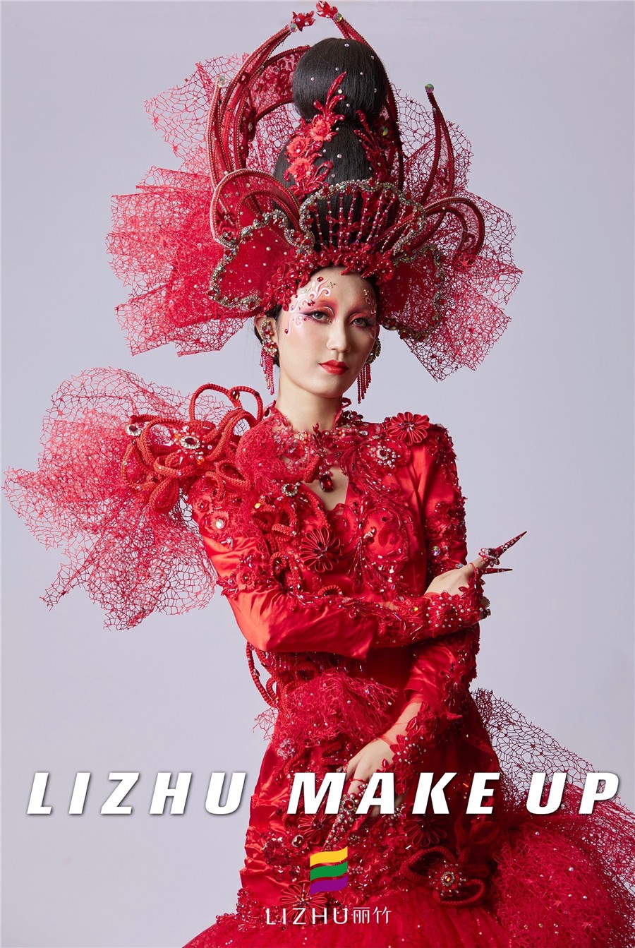 南寧彩妝造型培訓(xùn)學(xué)校創(chuàng)意彩妝作品---戰(zhàn)姬:這款整體造型以“中國(guó)紅”為主色,修身的魚尾裙擺設(shè)計(jì)配以水鉆、刺繡和精致的頭飾,妝面以紅色為主,運(yùn)用簡(jiǎn)單線條描繪以及大面積暈染的手法處理,妝面與服裝、頭飾相呼應(yīng),視覺(jué)沖擊十足。