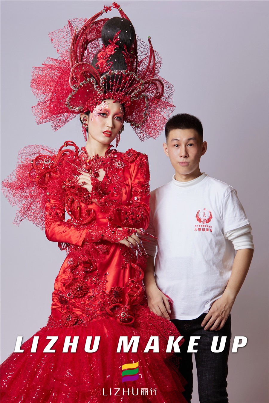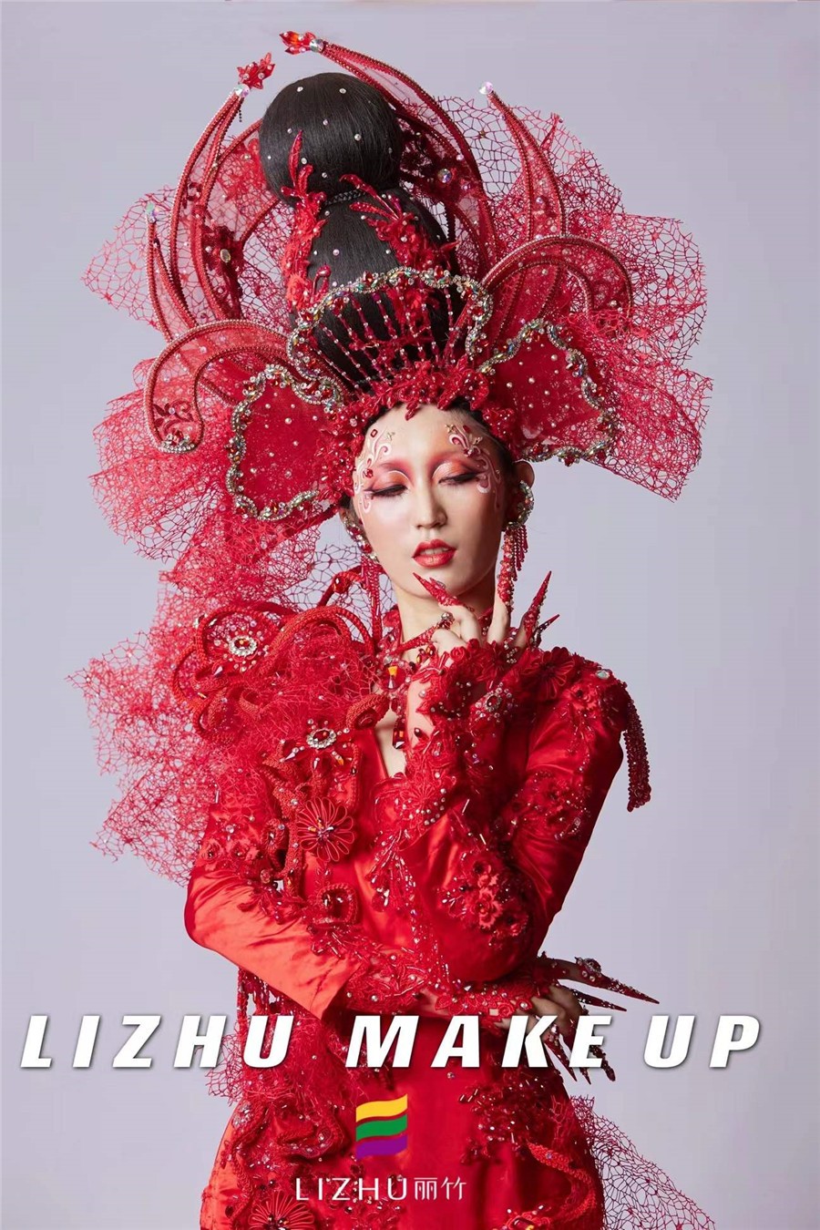 南寧創(chuàng)意造型培訓(xùn)學(xué)校創(chuàng)意彩妝作品---戰(zhàn)姬:這款整體造型以“中國(guó)紅”為主色,修身的魚尾裙擺設(shè)計(jì)配以水鉆、刺繡和精致的頭飾,妝面以紅色為主,運(yùn)用簡(jiǎn)單線條描繪以及大面積暈染的手法處理,妝面與服裝、頭飾相呼應(yīng),視覺(jué)沖擊十足。