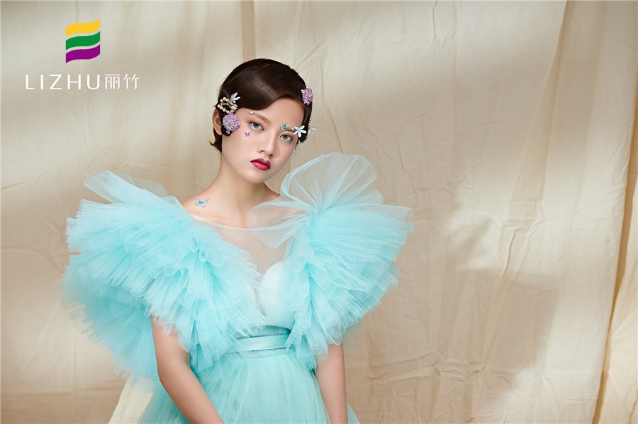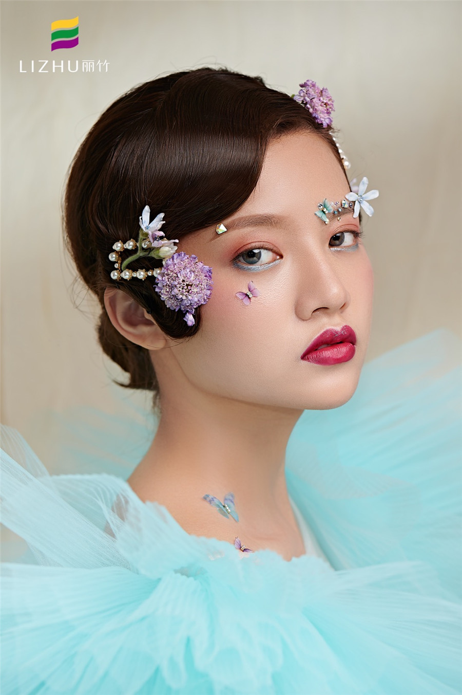 麗竹學(xué)校彩妝作品---流光·化蝶 ·夢幻:藍(lán)色輕紗加上妝容花朵點(diǎn)綴,頭飾與發(fā)型的完美搭配,流淌出輕柔舒緩之美,簡約自然的情緒態(tài)度。