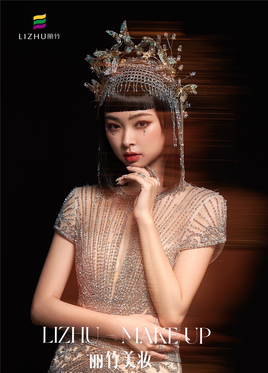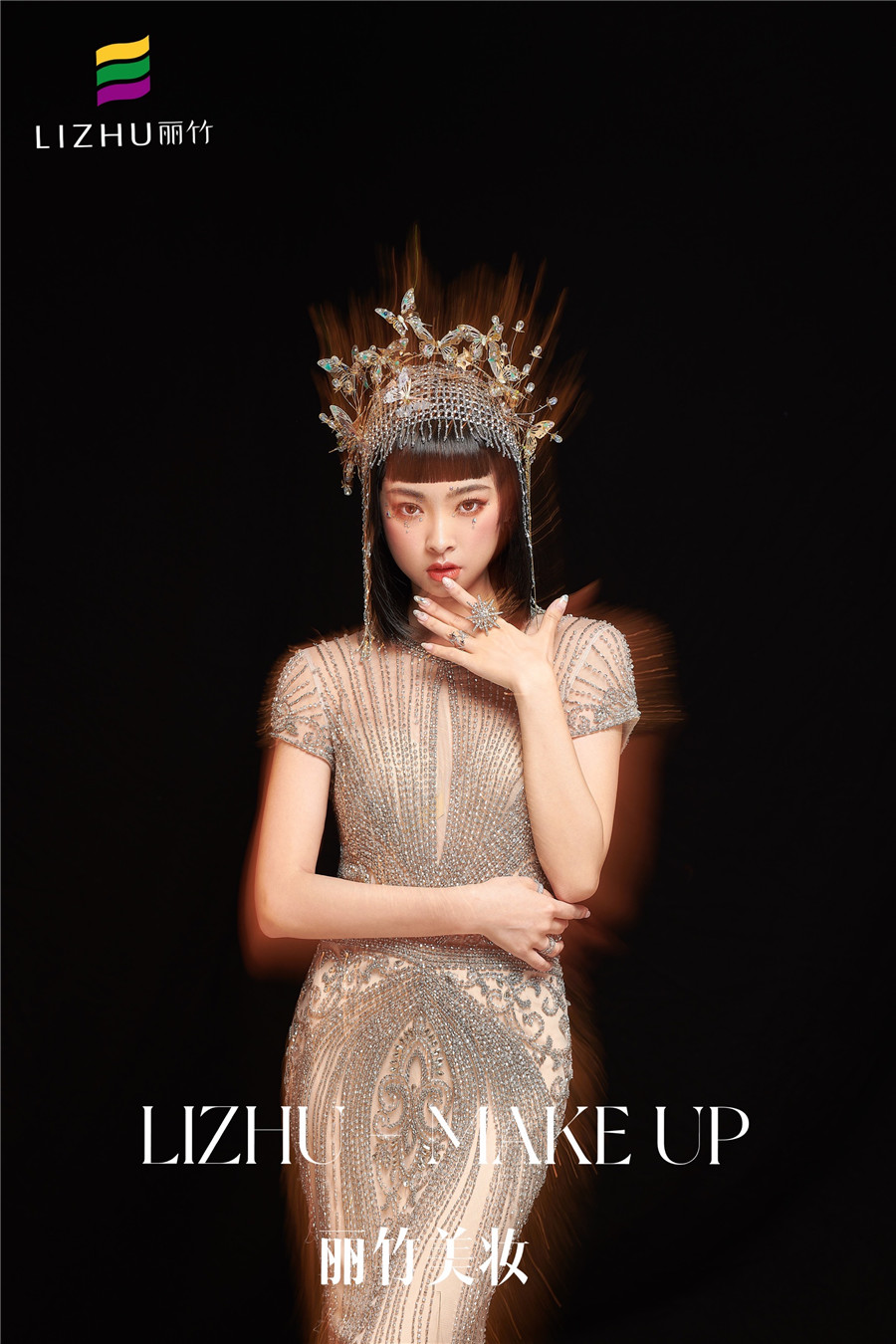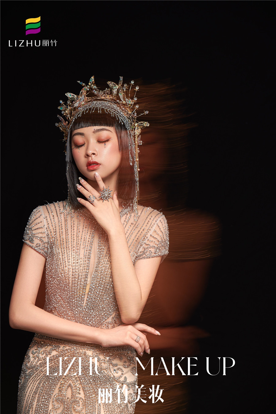 麗竹化妝學(xué)校作品---輕奢復(fù)古造型:奢華透視薄紗款禮服,勾勒出婀娜曼妙的身姿,頭飾與服飾滿鉆的鑲嵌,閃爍波光粼粼的神秘感,如夢(mèng)如幻間與現(xiàn)實(shí)交替。