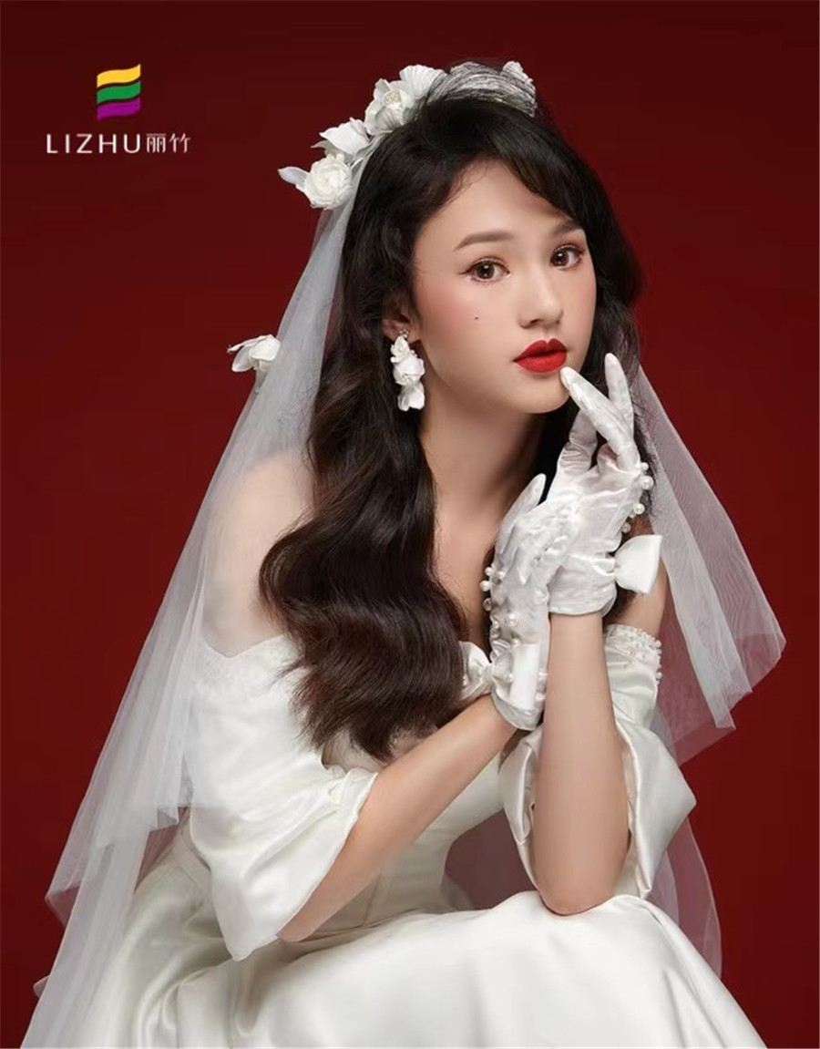 南寧人氣高的化妝學校作品---韓式披發(fā)新娘造型:很淑女又具優(yōu)雅風的長卷發(fā)發(fā)型,佩戴白色鮮花點綴的純白頭紗,配上清透簡約的韓式妝容,打造出了新娘優(yōu)雅的浪漫氣息。