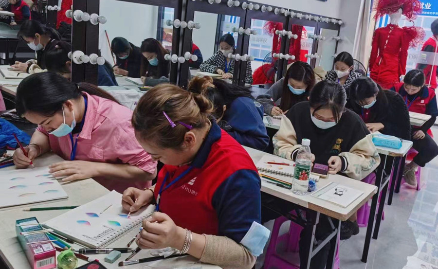南寧化妝正規(guī)專業(yè)學(xué)校-學(xué)員正在進(jìn)行眼影紙上繪畫練習(xí)
