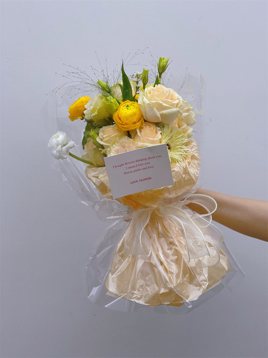 在進(jìn)行圓形花束的制作時(shí),在確定主花后,便可以按照螺旋的方式一次添加花材,使得整束花看起來(lái)飽滿(mǎn)之后,稍作調(diào)整成為一個(gè)圓形的輪廓,然后便可以用繩子在根部綁好進(jìn)行修剪。花材處理好了之后,將包裝紙裁剪出適當(dāng)?shù)拇笮。缓蟾鶕?jù)花的形狀包裹起來(lái),用彩帶幫緊并打成一個(gè)蝴蝶結(jié),這樣圓形小花束就完成了。