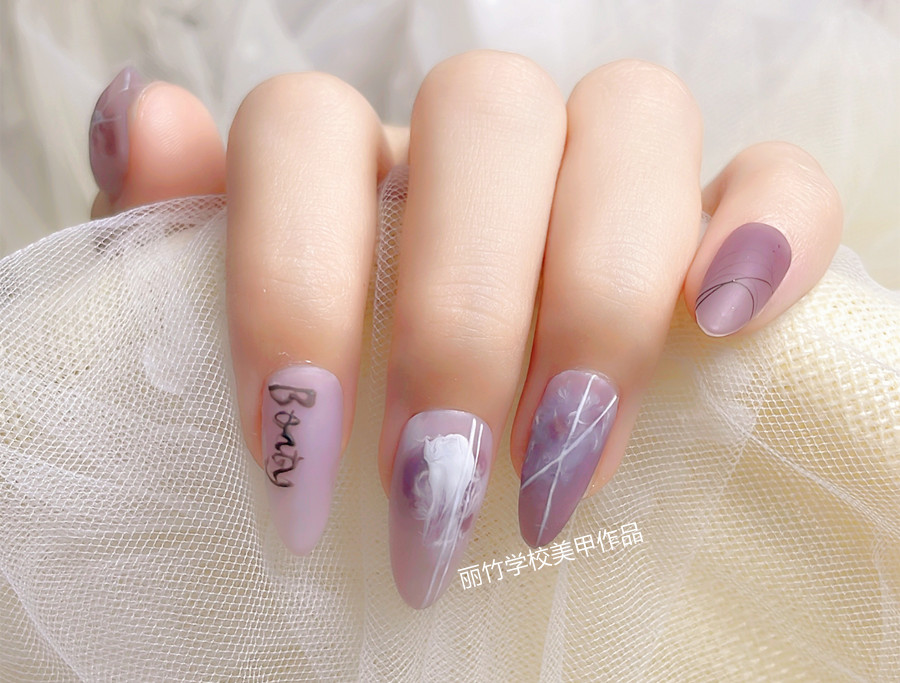 廣西學(xué)美甲技能、廣西培訓(xùn)美甲造型分享:溫柔紫色作為主色調(diào),白色彩繪筆隨意繪制的線條,讓色彩多了一份活潑的感覺。