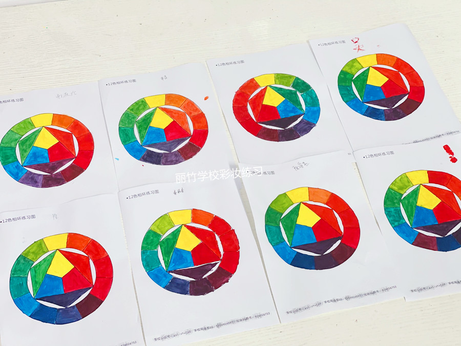 化妝基礎(chǔ)理論知識(shí)、南寧化妝基礎(chǔ)教學(xué):在今天的南寧化妝課堂上,學(xué)員們?cè)诼?tīng)完玉老師講解的關(guān)于色彩十二色環(huán)的理論知識(shí)后,便拿出畫(huà)筆顏料,根據(jù)三原色,冷暖色系的搭配等,進(jìn)行十二色環(huán)紙上練習(xí)。下面,和南寧化妝師培訓(xùn)學(xué)校-麗竹化妝培訓(xùn)一起學(xué)看看學(xué)員們的練習(xí)成果如何吧?