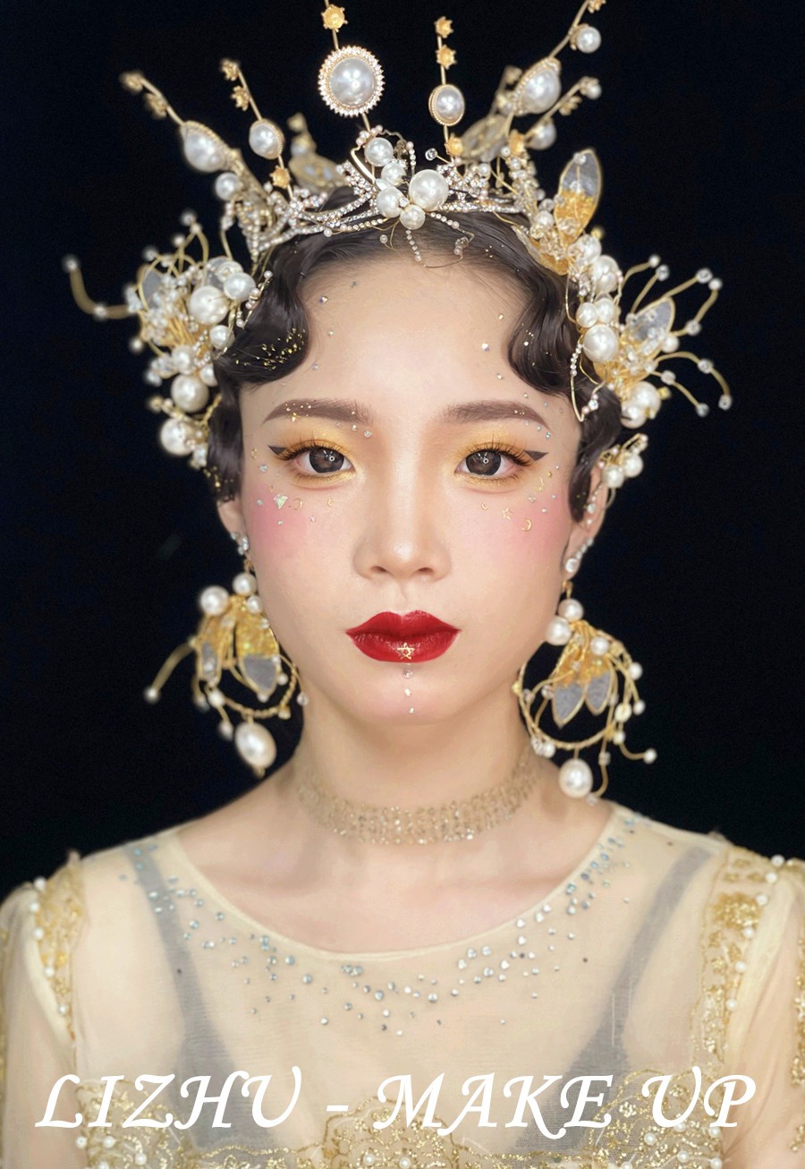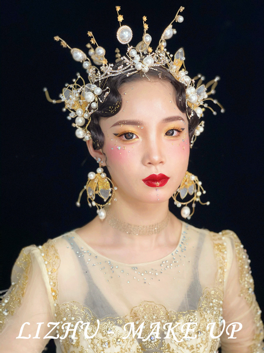 廣西彩妝創(chuàng)意培訓(xùn)學(xué)校作品欣賞:復(fù)古手推波高聳發(fā)髻,金黃高奢珍珠碎鉆發(fā)飾點(diǎn)綴,佩戴同款奢華大氣耳飾,烈焰紅唇襯托大氣底妝,金屬亮片飾品裝飾整臉妝容,身穿重工釘珠打造禮服,氣場強(qiáng)大的高奢妝容造型映入眼簾。
