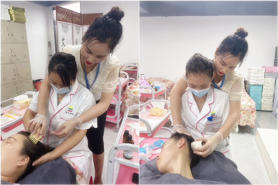 南寧美容專業(yè)課程:在對(duì)頭部疏通經(jīng)絡(luò)操作前,無(wú)需要頭部頭部涂抹精油,疏通的工具盡可能選擇寬齒按摩梳。在操作時(shí),一手扶住頭部,一手握住按摩梳來(lái)回刮拭疏通,速度適中,切勿用力過(guò)猛。