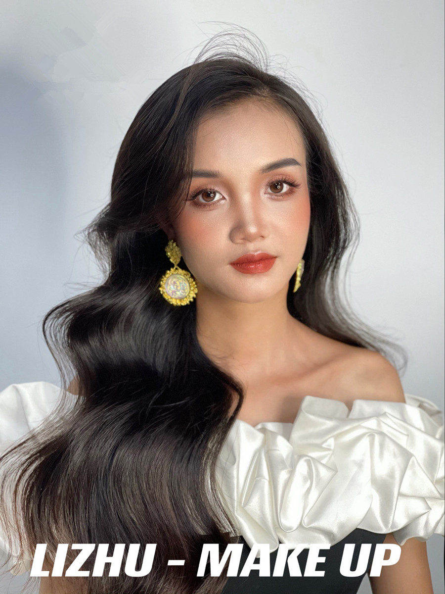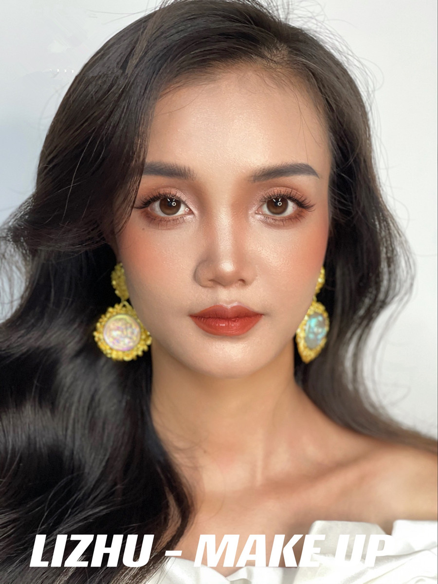腮紅和唇妝采用同色系,起到承上啟下相互呼應的作用。發(fā)型采用靈動流暢的披發(fā)造型,使得整個妝面的打造更具有魅惑特點,彰顯出了濃顏系的泰式妝容。
