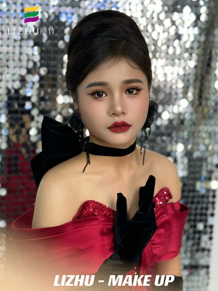 南寧化妝美業(yè)學(xué)習(xí)、南寧化妝彩妝(麗竹化妝彩妝培訓(xùn))作品---復(fù)古年會造型:明媚動人氣質(zhì)妝容,簡約大氣復(fù)古赫本發(fā)型,佩戴夸張黑色花朵配飾,身穿酒紅色亮片抹胸禮服,仿佛置身于年會中的紅玫瑰。想知道南寧化妝學(xué)校哪家時尚?或是想知道南寧學(xué)化妝學(xué)費便宜的是哪家?歡迎大家趁著麗竹學(xué)校正在進(jìn)行招生優(yōu)惠活動之際,關(guān)注麗竹學(xué)校彩妝專業(yè),...
