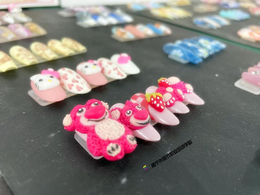 南寧美甲造型專業(yè)學(xué)校(麗竹美甲造型學(xué)校)的同學(xué)們,在南寧美甲實(shí)訓(xùn)課上,就運(yùn)用老師教的雕花美甲技術(shù),使用具備立體質(zhì)感的雕花膠做出了栩栩如生的草莓熊美甲。如果你想進(jìn)行零基礎(chǔ)美甲培訓(xùn),或是已經(jīng)具備基本美甲基礎(chǔ)想知道南寧美甲進(jìn)修去哪里?麗竹學(xué)校美甲專業(yè)教學(xué),口碑與技術(shù)兼具,就業(yè)率高,是你的不二之選。