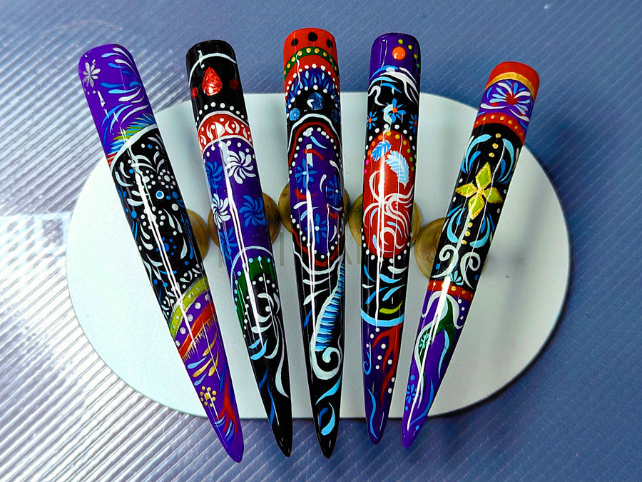 美甲技法解析:作品全程采用手繪的方式進(jìn)行描繪。其難點(diǎn)在于對(duì)于壯錦五顏六色的色彩比例搭配,圖案間的結(jié)構(gòu)嚴(yán)謹(jǐn)性,排列布局的整體把握,以及在描繪圖案時(shí)需要極強(qiáng)的細(xì)心和耐心。