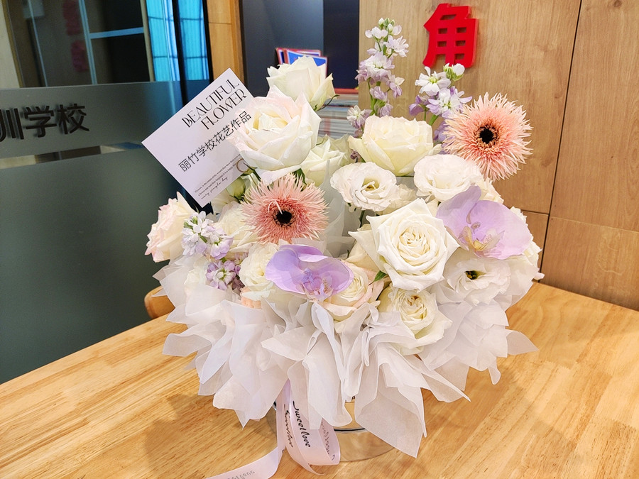 看吧!在老師的指導(dǎo)下,還有同學(xué)們自己的努力下,一個(gè)清新養(yǎng)眼且浪漫十足的白色玫瑰花抱抱桶就完成啦!純白無(wú)瑕的花束下,代表了不摻雜任何瑕疵的愛(ài)情,想必收到這個(gè)花藝作品的女孩定會(huì)十分歡喜。