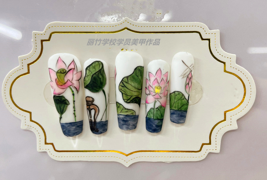 廣西美甲學校考試、廣西學美甲彩繪:炎炎夏日,正是是荷花開得正旺的季節(jié)。如果你是愛荷之人,想必你一定會去看看那滿塘的粉色荷花。而如果碰上喜愛美甲又喜愛荷花之人,那你就能看到荷花躍于“指”上的搖曳身姿。