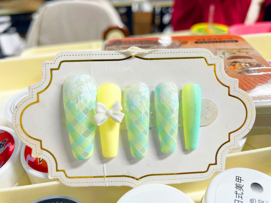 廣西美甲學(xué)習(xí)中心、廣西美甲進修提升作品解析:作品以白色、薄荷綠以及檸檬黃三種顏色為主。先用乳白色甲油膠作為底色,然后再用彩繪筆畫出格紋線條,并以不規(guī)則的方式用薄荷綠以及檸檬黃兩種顏色進行填充。之后在畫出白色的小雛菊作為主花,在檸檬黃甲片上粘貼蝴蝶結(jié)視頻,使得整副作品春意盎然,氛圍感十足!