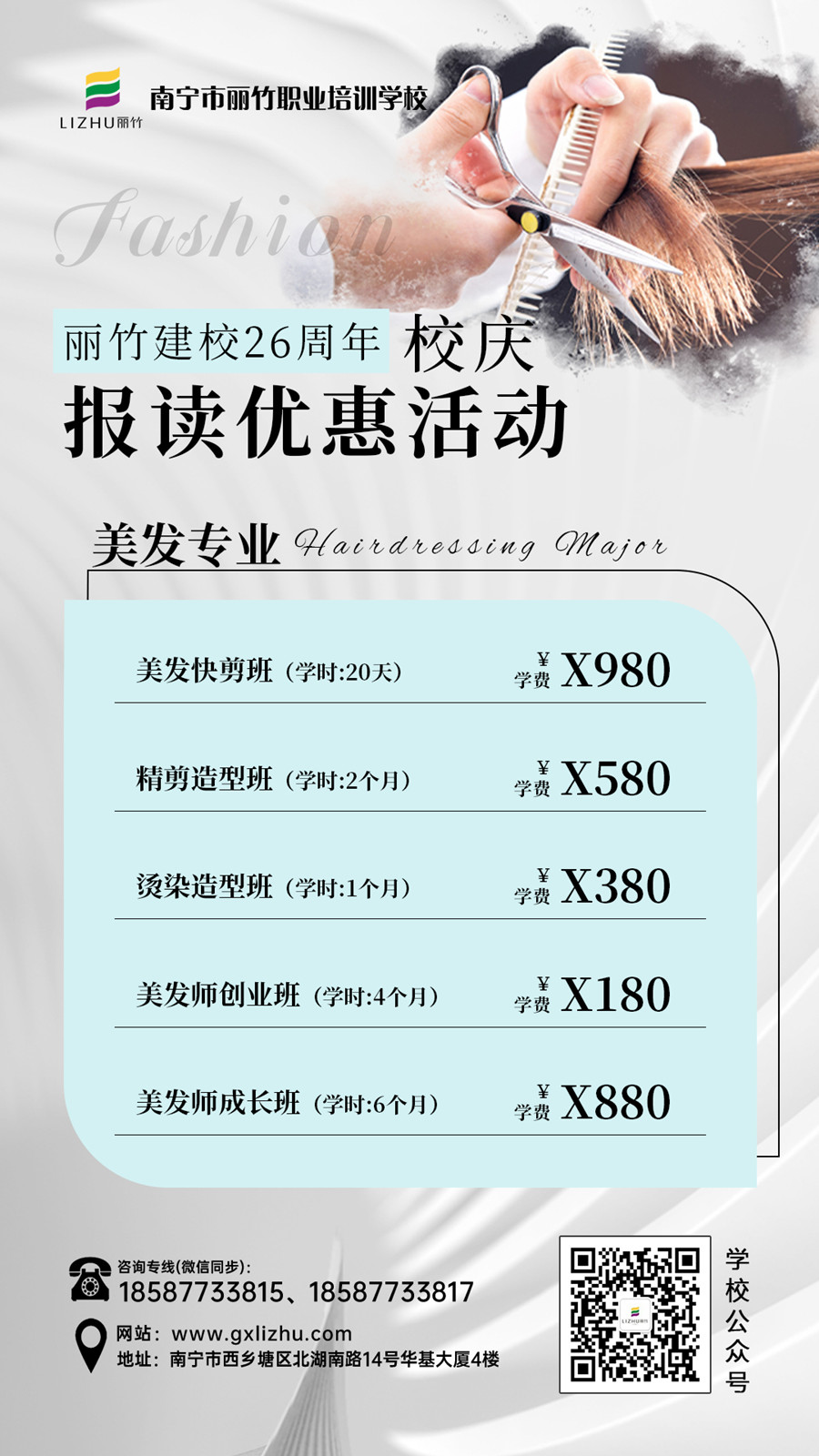 要是你還想獲取更多美發(fā)知識(shí)或是南寧美發(fā)資訊,亦或是想知道廣西美發(fā)學(xué)校哪家出名?相信廣西美業(yè)人對(duì)南寧美業(yè)職業(yè)培訓(xùn)學(xué)校(麗竹學(xué)校)一定不會(huì)感到陌生?,F(xiàn)在學(xué)校正在進(jìn)行報(bào)讀優(yōu)惠活動(dòng),想學(xué)美發(fā)的小伙伴趕緊報(bào)名吧!