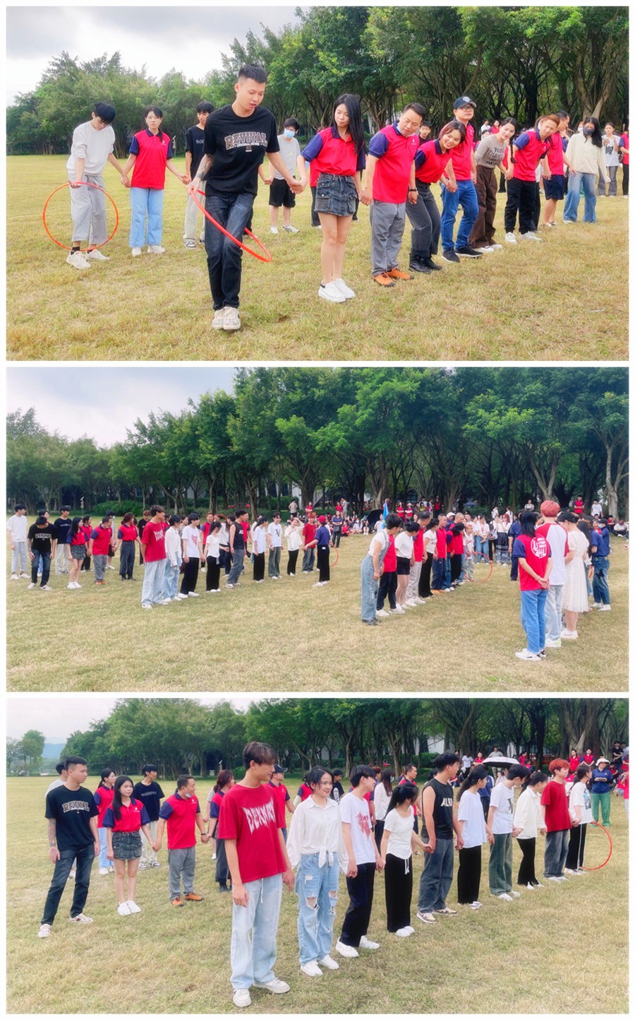 同學們手拉手圍成一圈,相互拉著的手不能放開,也不能用手指去勾呼啦圈,用呼啦圈穿過所有人的身體回到原位,用時快的隊伍獲勝。看著場上同學們奮勇拼搏,場外的同學高聲吶喊加油,氣氛熱烈,彰顯出同學們的熱情與青春活力。