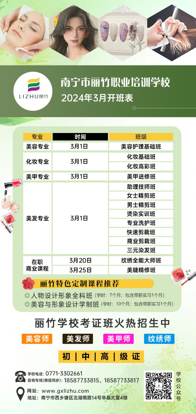 如果你想學(xué)習(xí)美業(yè)技術(shù),想在廣西零基礎(chǔ)學(xué)美容美發(fā)?想知道廣西化妝美甲培訓(xùn)在哪里?廣西哪里學(xué)紋繡專業(yè)?同時(shí)還想到廣西美睫學(xué)校去學(xué)美睫?那么,請你千萬不要錯(cuò)過廣西美業(yè)專業(yè)職業(yè)學(xué)校-麗竹學(xué)校3月的開班安排了啦!早學(xué)早就業(yè),就能早點(diǎn)實(shí)現(xiàn)人生目標(biāo)。
